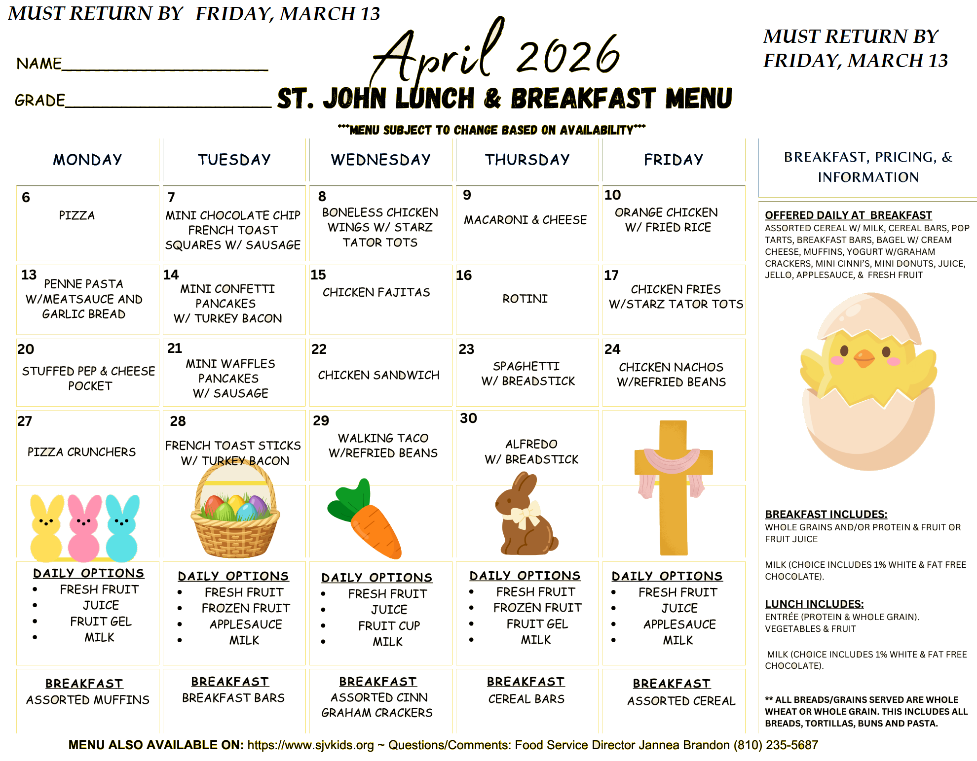 MDE Dietary Needs Request Form USDA Non-Discrimination Statement Wellness Policy SJV Smart Snack Policy SJV Smart Snack Policy PDF USDA Smart Snack Policy PDF To contact the Food Service Director, please call (810)235-5687 or email SJVKids@SJVKids.org
